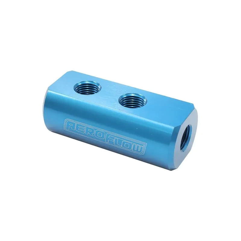 Aeroflow Performance has designed these compact distribution blocks for universal applications. Such as a vacuum block distribution to plumb up additional vacuum ports for accessories like MAP sensors, boost gauges, blow off valves, or hooking up individual throttle bodies. Coolant lines for header tanks or LS steam pipe lines and nitrous oxide lines. Available with 1 port in and 4 ports out and 1 port in and 6 ports out, these ports are all 1/8″ NPT.