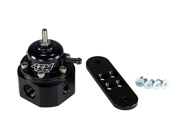 AEM’s Universal Adjustable Fuel Pressure Regulator (AEM 25 302BK) is capable of supporting enough fuel flow for engines up to 1000 horsepower. Our universal AEM FPR is tapped to accept a -6 AN, or 9/16″x18 fittings and includes a 1/8 NPT port for a fuel pressure gauge or pressure sensor pick up.