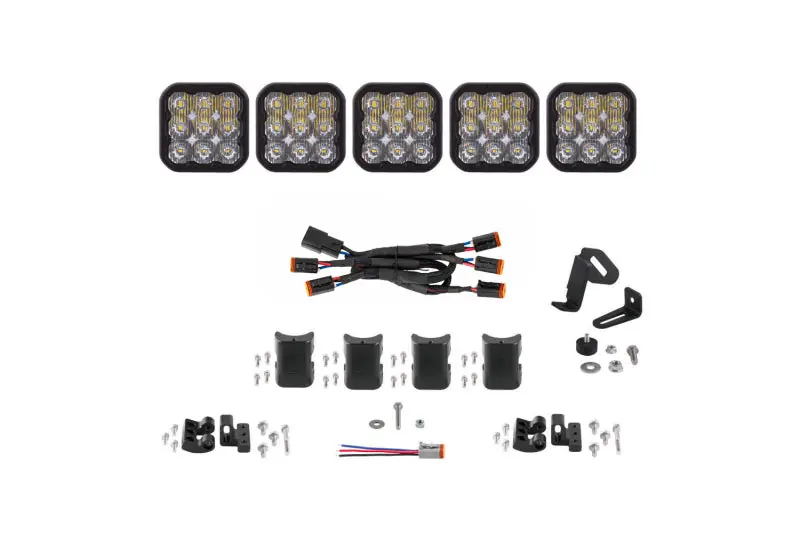 FeaturesFive-pod 31.5-inch linked lightbar Engineered TIR (total internal reflection) optics Selectable backlight color, with eight color options Torture-tested, heavy-duty construction Ultra-high intensity: shines almost a mile away Assembled in USAOverview Using our patent-pending CrossLink technology, this kit links five SS5 LED pods together into a single lightbar. Featuring the highest output intensity of any 5-inch LED pod on the market, the LED pods included in this kit have been designed for maximum functionality, with custom-engineered TIR optics, all in a durable package. Focused. Traditional optics like reflectors or simple lenses lose light internally and to glare, so not all of the light shines on target. Instead, the custom-engineered TIR optic in the SS5 collects all of the light from the LED, and directs it only where you need it, drastically reducing glare and improving total efficiency. Selectable Backlight. The Stage Series 5inch LED Pods included in this kit feature a selectable backlight with eight different color options. Selecting your backlight color is easy – simply alternate the power on and off. There’s no complicated programming with a controller! The SS5’s backlight fully illuminates the TIR optic, providing unique accent lighting that you won’t find on other LED pods. NOTE: Due to the yellow lens, the Yellow kit is only available with an Amber backlight color. Simple connections. All SS5 LED pods feature a custom-molded DT type Deutsch-style connector. A DT wiring harness is included in the kit to connect the pods together, along with a 6-inch pigtail with bare leads. For installation, you can wire yourself, use an off-the-shelf Deutsch DT sized wire harness, or use a Diode Dynamics wire harness.