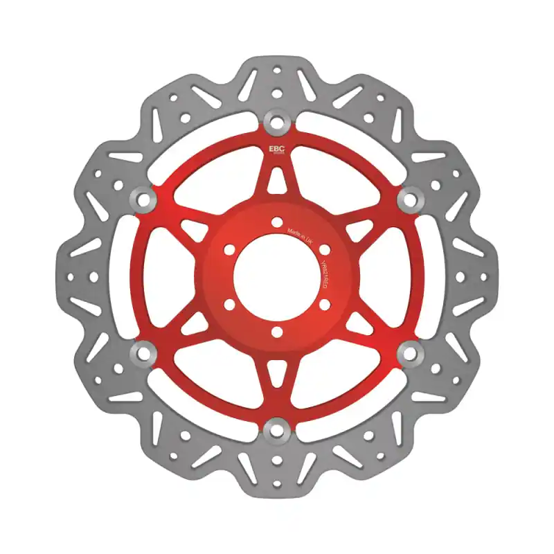 EBC Brakes™ Vee-Rotors™ Replacement Discs are British made discs using German mill rolled precision stainless steel rotor blades with a VEE profile weight reducing profile mounted onto lightweight alloy center hubs, using the patented SD square drive button technology.