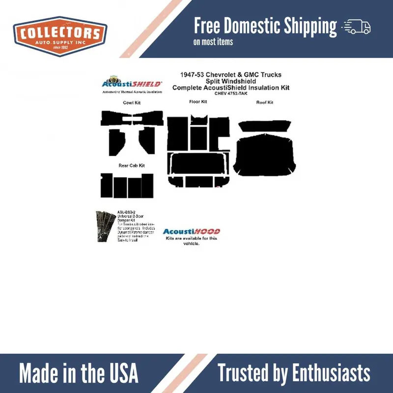 Upgrade your 1947-53 Chevrolet Truck with our Complete Insulation Sound Deadener Kit, designed specifically for classic car restoration. Made from high-quality foil backed jute insulation and sound dampening butyl strips, this kit enhances interior comfort by reducing noise and vibration while providing a thermal barrier. Experience a quieter ride with our Classic Sound Deadener solution.