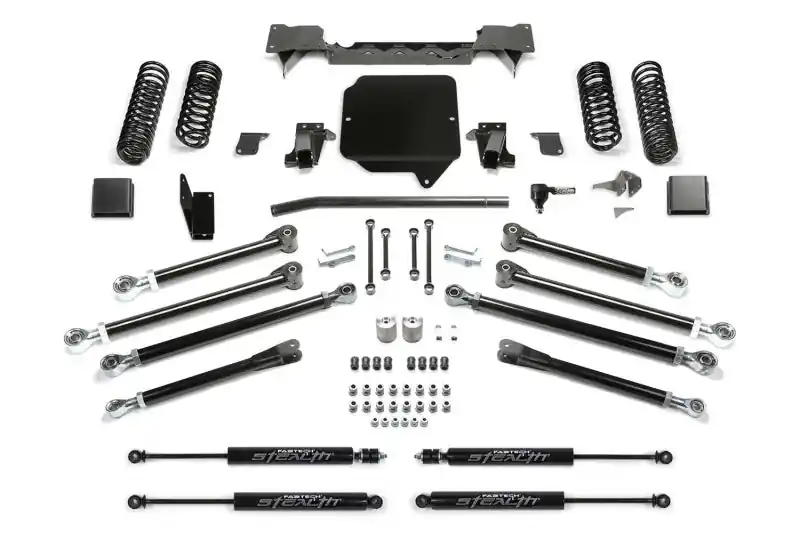 Fabtech’s Crawler long arm Gladiator lift kit is built to meet the most experienced driver’s expectations without having a questionably fabricated suspension. If you are in the market for a system that will work properly right out of the box and does not require continued fabrication and constant maintenance, look no further. A key part of the Crawler kit is the Link Arm geometry and ground clearance. The location of the of the link arms is critical in providing superior handling throughout the travel range. Fabtech has found the Gladiator’s sweet spot geometry for the link arms that provide a superior driving long arm system compared to all others on the market. Front link arms are mounted to a full width crossmember that spans frame rail to frame rail. This crossmember is key in not only in mounting the Links arms at the correct geometry but it adds critical strength to the Gladiator frame for hard offroad use. Adjustable rear links utilize the factory frame and axle brackets for an easy installation. The Fabtech lower Link Arms are massive and built of 2in OD .313 thick wall tubing that is guaranteed not to bend. Upper and lower Link Arms includes the Fabtech’s legendary 5 Ton joints that come with lifetime guarantee of never wearing out. They are superior for offroad use with a smooth quiet operation on the street. This high quality Long Arm Gladiator lift kit will provide exceptional offroad performance with good highway manners for the discerning Jeep enthusiast. Each Fabtech component has been designed with specific features and benefits that create this quality suspension system. What’s In The System: Front Upper and Lower Link Arms. Rear Upper and Lower Link Arms. Front Link Arm Crossmember. Heavy Duty Flipped Draglink. Front and Rear Track Bar Brackets. Front and Rear Corner Specific Dual Rate Coil Springs. Front and Rear Sway Bar Links. Front Shock Mount Bracket. Front and Rear Bump Stop Extensions. LINK ARMS: Heavy duty is the only way to describe these