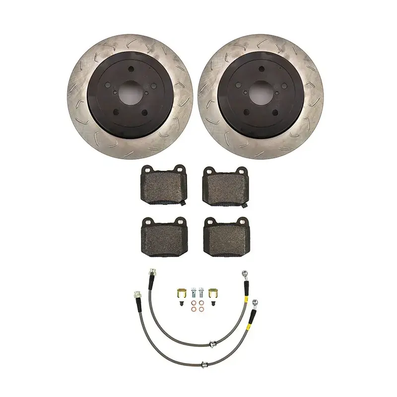 This kit includes new rotors, brake pads, and stainless steel brake lines to improve the braking performance of your vehicle.