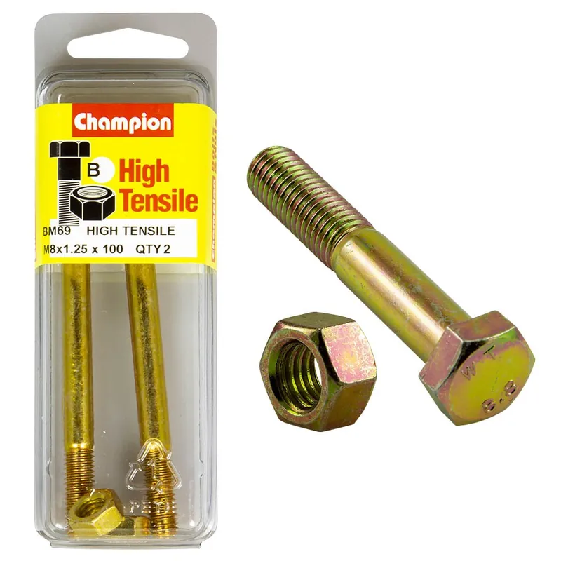 Get Yours Champion Pack of 2 (2x Zinc Plated Hex Bolts, 2x Nuts) M8 x 100mm High Tensile Grade 8.8 – BM69