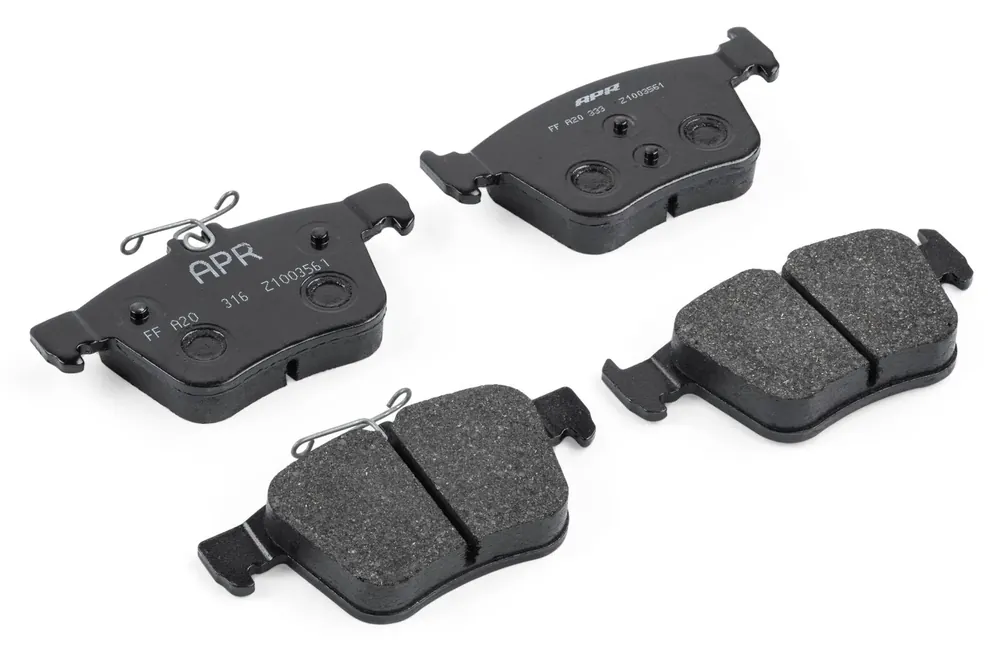 APR OE Replacement Advanced Street Pads are a direct upgrade for your factory brake. This pad material will remain fade free to operating temperatures that far exceed typical OE pads. The material has a high friction co-efficient but is engineered to deliver torque curves that will extract the most from street-legal tires without overwhelming them and causing premature wheel lockup. The fairly low thermal conductivity of this friction material slows the rate of heat transfer to the brake calipers, pressure seals and brake fluid. This pad compound delivers the type of pedal feel and fade resistance that are normally associated with entry-level race pads but it also delivers very good cold response and low disc wear, which a race pad would not when used on a street car. They pair perfectly with the APR Direct Replacement Brake Discs, and provide a no-compromise solution for spirited daily driving.
